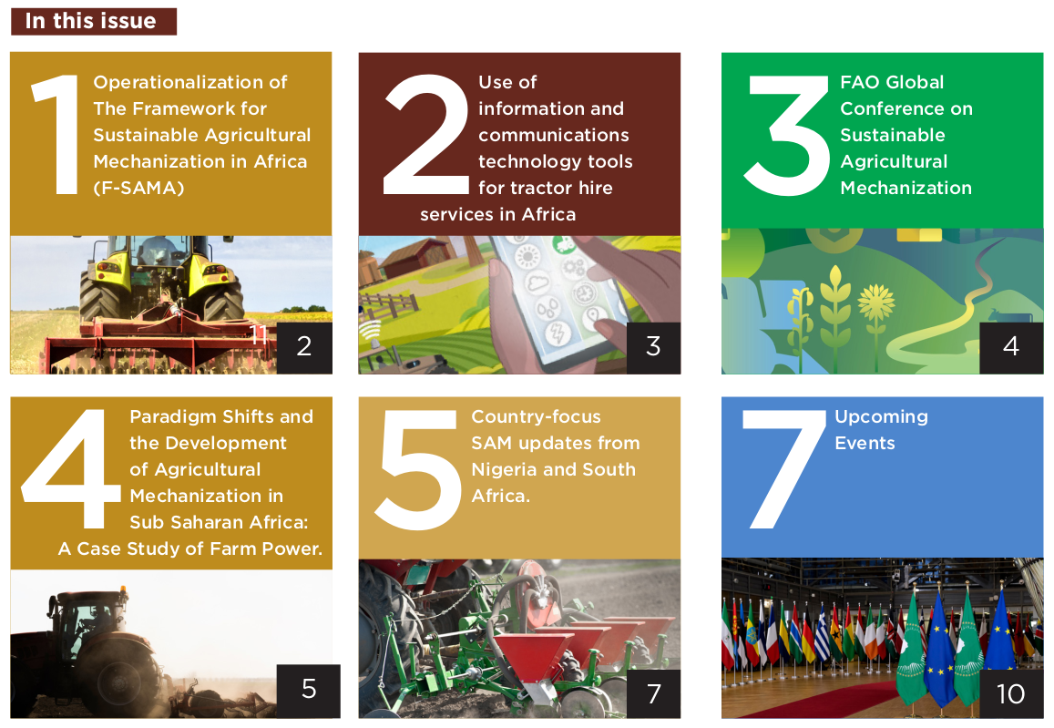 This is the first quarterly newsletter of the AfricaMechanize Platform, with the objective of connecting stakeholders in sustainable agricultural mechanization (SAM), and supporting the joint actions for operationalization of the Framework for Sustainable Agricultural Mechanization (F-SAMA).